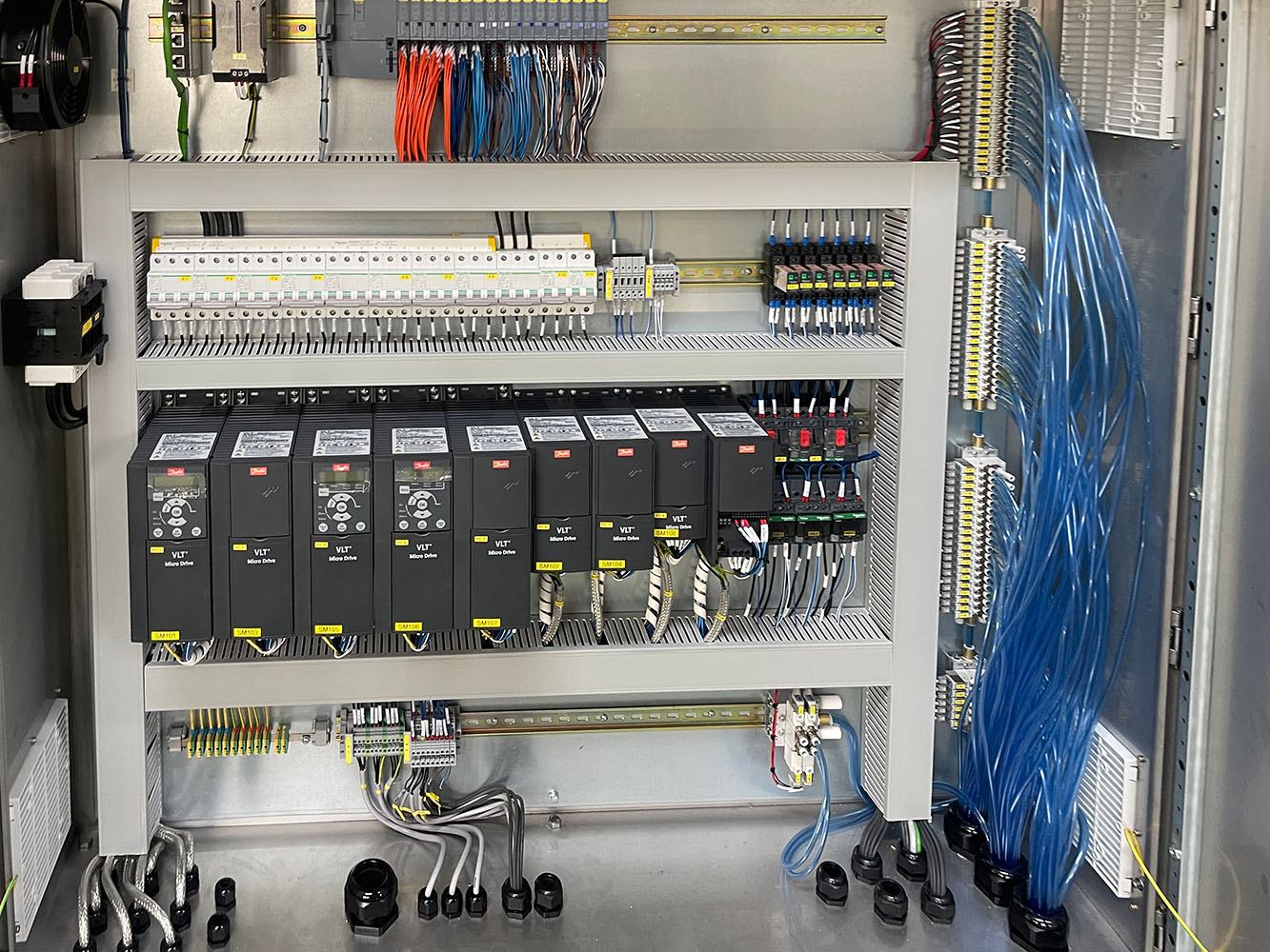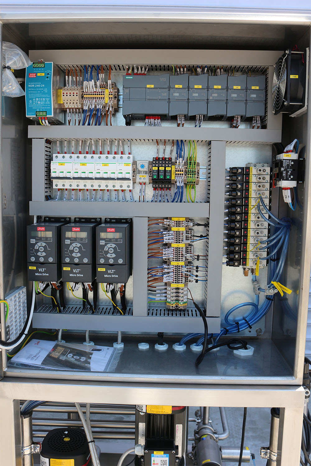 SKE control cabinet is semi-automatic which is specially designed for small size brewery. The cabinet is welded on brew deck and mounted all international famous brand of elements and instruments, including Omron temperature controllers, Danfoss VFDs, IFM flowmeters, temperature sensors, Schneder DC power, breaker, switches, relay, etc